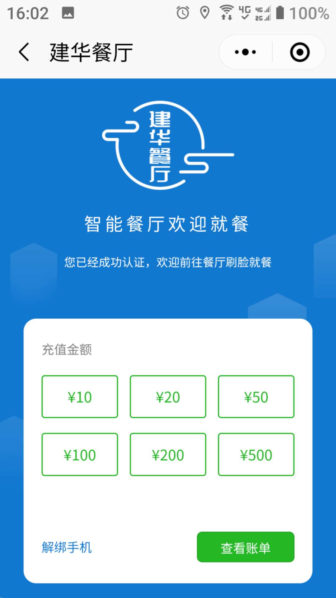 建华餐厅系统使用微信刷脸支付方式作为支付方法。管理员需要在管理后台将用户信息导入,并设置好用户分组及价格。用户可用微信扫码方式在手机微信里注册、充值、查询。在餐厅现场可开通刷脸支付后,通过刷脸方式直接扣除预存金额。